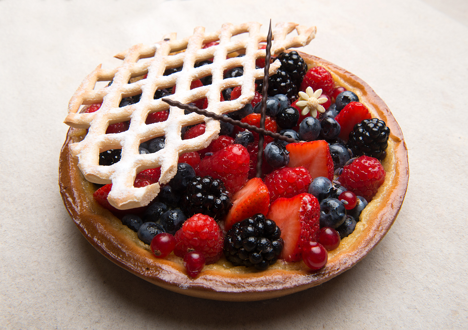Draai van de grondstoffen een soepel deeg met een deegtemperatuur van 24° C. Verdeel in 4 stukken van 300 gram en 4 van 225 gram. Bolrijs van 20 min. Rol deze uit op 3 mm en fonceer de vlaaien pan. Rol de 4 andere stukken van 225 gram ook uit op 3 mm en rol ze over het raster en snij ze uit ter grote van de vlaaien pan.