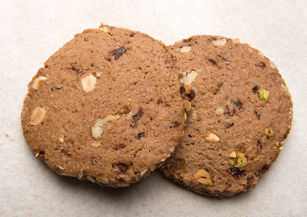 Maak van alle ingrediënten een zetdeeg en rol deze vervolgens tot een pil van 2 kilo en 8 cm dik. Deze daarna door de havervlokken rollen. Goed afkoelen in koelkast of vriezer en stukken van 2 cm snijden.